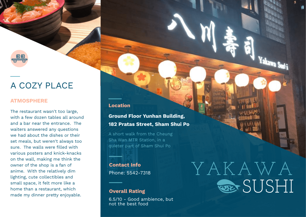 Yooo Kacy! First, the poster looks dope. You certainly know what you’re doing with your poster design. I also like your description of the atmosphere. It sounds cozy! Then I scrolled down and didn’t know where to look. I agree with Ruby; the flow needs some work. I would have also liked a picture of a menu, though I understand it would be hard to fit it in your template. Still, you described the meals in good detail. You also came up with several constructive criticisms for the restaurant, which was the best part of this in my opinion. Overall, an aesthetically pleasing and descriptive presentation. Good job!