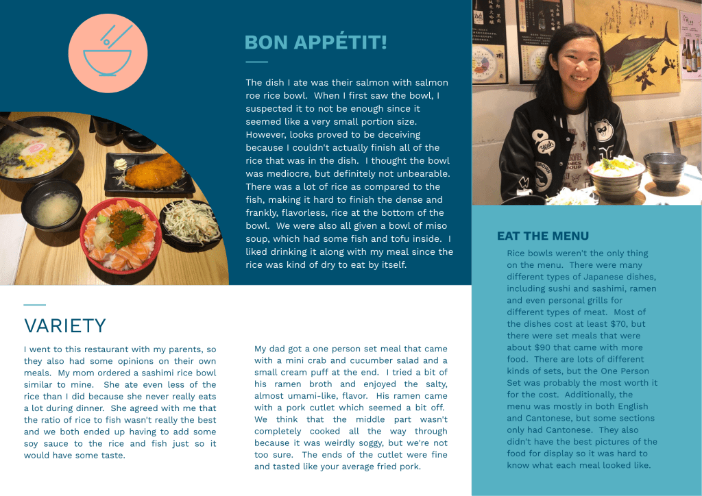 When we were given this assignment, I had probably only been out once a week if that. The introverted side of me was overjoyed by this, and didn’t want to go out specifically for this assignment. But I went to a new place and was surprised by how much I enjoyed the restaurant and the food. Then going home with a few pictures, I set to work on designing this review. It made me feel like a reporter of sorts when I asked my parents about their meals as well because I only had so much to say about my own meal. Overall, I’m proud of this piece and think it turned out great.